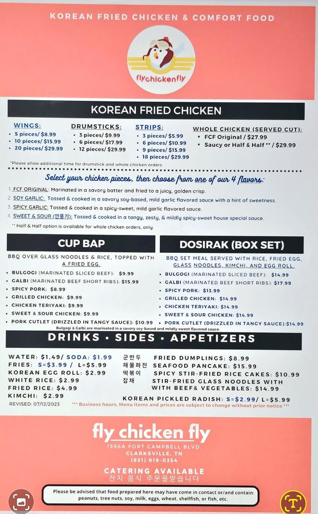Welcome to Fly Chicken Fly, a delightful gem nestled in the heart of Clarksville, Tennessee, at 1596a Fort Campbell Blvd. This family-owned restaurant serves up authentic Korean dishes that promise to tantalize your taste buds and leave you craving more.